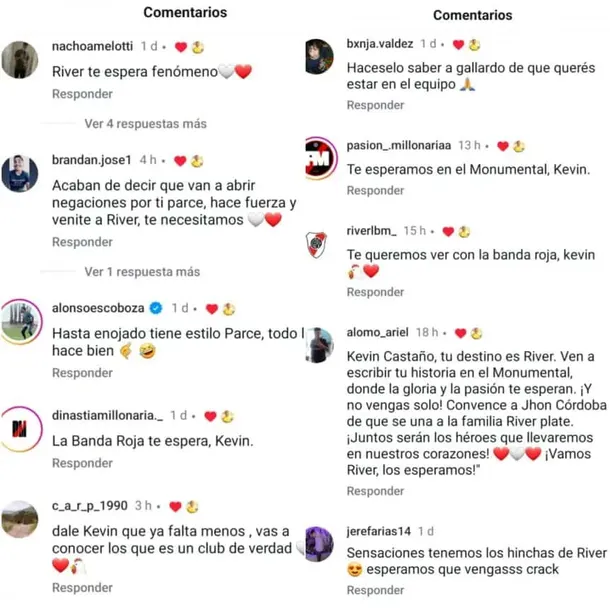 En varias publicaciones de Instagram, el volante central interactuó con mensajes de hinchas riverplatenses que le pedían dar el salto al equipo de Marcelo Gallardo, dejando likes y corazones en comentarios como: “Hacéselo saber a Gallardo de que querés estar en el equipo”.