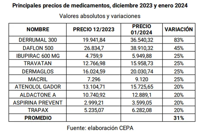 Los diez medicamentos más consumidos por los adultos mayores sufrieron aumentos por encima de la inflación en promedio con subas mensuales del 83% y el 45% en enero mientras que la canasta de medicamentos subió 13,6%. Así lo reveló un informe reciente de CEPA junto a CEPPEMA y ALGEC. Señaló Ámbito.