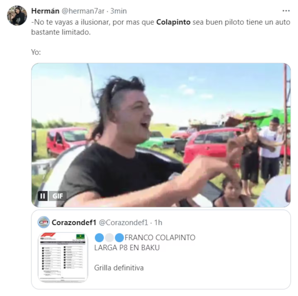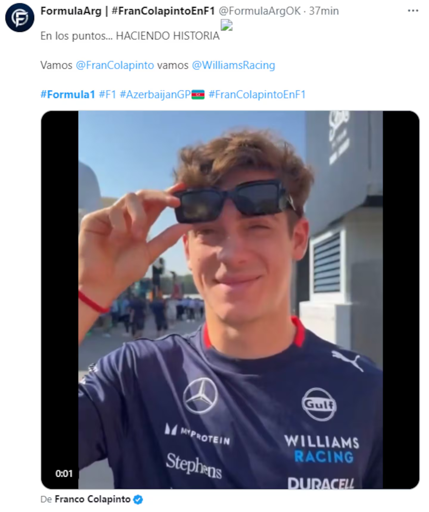 Franco Colapinto terminó octavo en el Gran Premio de Bakú de la Fórmula 1 con Williams y los fanáticos reaccionaron con divertidos memes en las redes sociales.