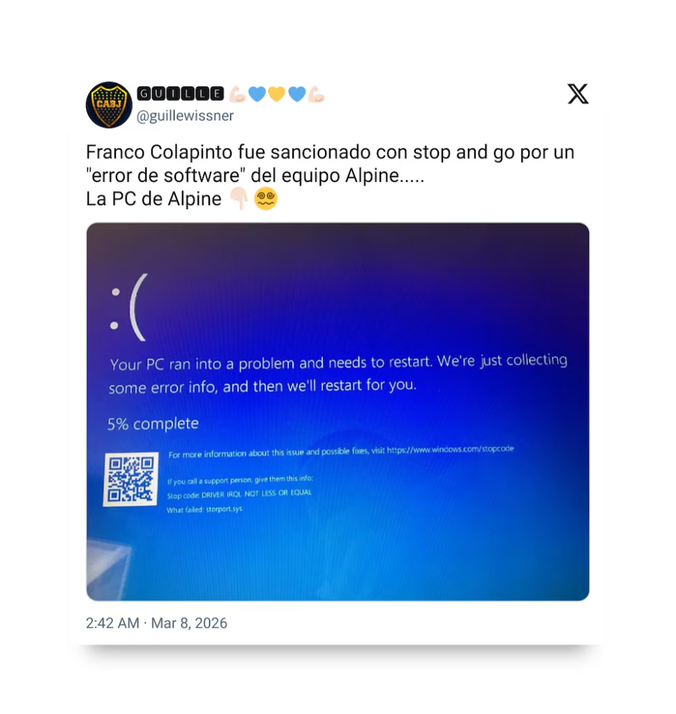 No obstante, en las redes, los fanáticos sudamericanos, que vivieron la carrera de madrugada, apuntaron contra el equipo francés y su cara visible, el italiano Flavio Briatore, por el error que le costó la penalización a Colapinto y los problemas en la clasificación.