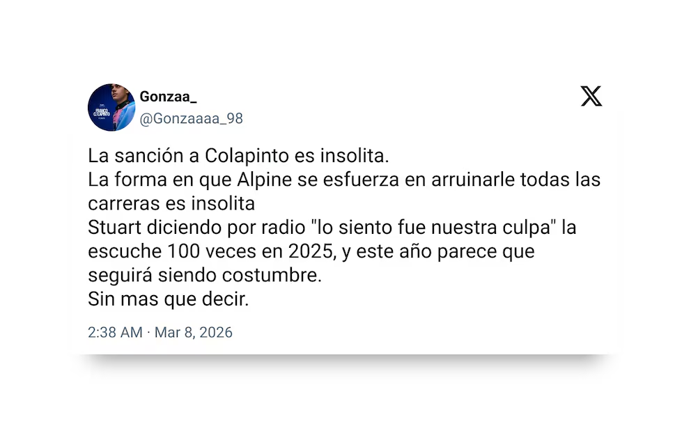 Aunque se lamentó, el piloto bonaerense buscó enfocarse en los próximos desafíos y no en criticar a la estructura de Alpine. “Basándonos únicamente en el resultado, no es donde queríamos estar; sin embargo, sin duda, hay aspectos positivos que sacar del ritmo de carrera y de los datos recopilados, de los que podemos aprender para futuras carreras. Desde nuestra posición inicial en la parrilla, siempre iba a ser difícil y, al final, la penalización por una infracción en la salida nos impidió luchar más arriba. Ganamos y perdemos como equipo, y estamos juntos en esto. Tuve suerte de terminar la carrera, ya que casi terminó en la salida con un momento de susto al intentar esquivar a Lawson, que salía muy lento. Casi lo golpeo por detrás y logré verlo en el último minuto”, expresó.
