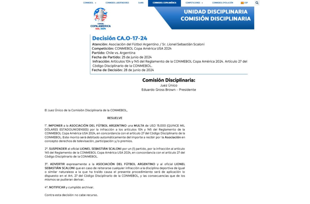 Lionel Scaloni no dirigirá a la Selección argentina ante Perú por la fecha 3 del grupo A de la Copa América. El entrenador fue suspendido por un partido por entrar tarde al segundo tiempo en el encuentro ante Chile y no podrá estar en el campo de juego el sábado. Además, la Asociación del Fútbol Argentino tendrá una multa económica de parte de la Comisión Disciplinaria de la Conmebol.