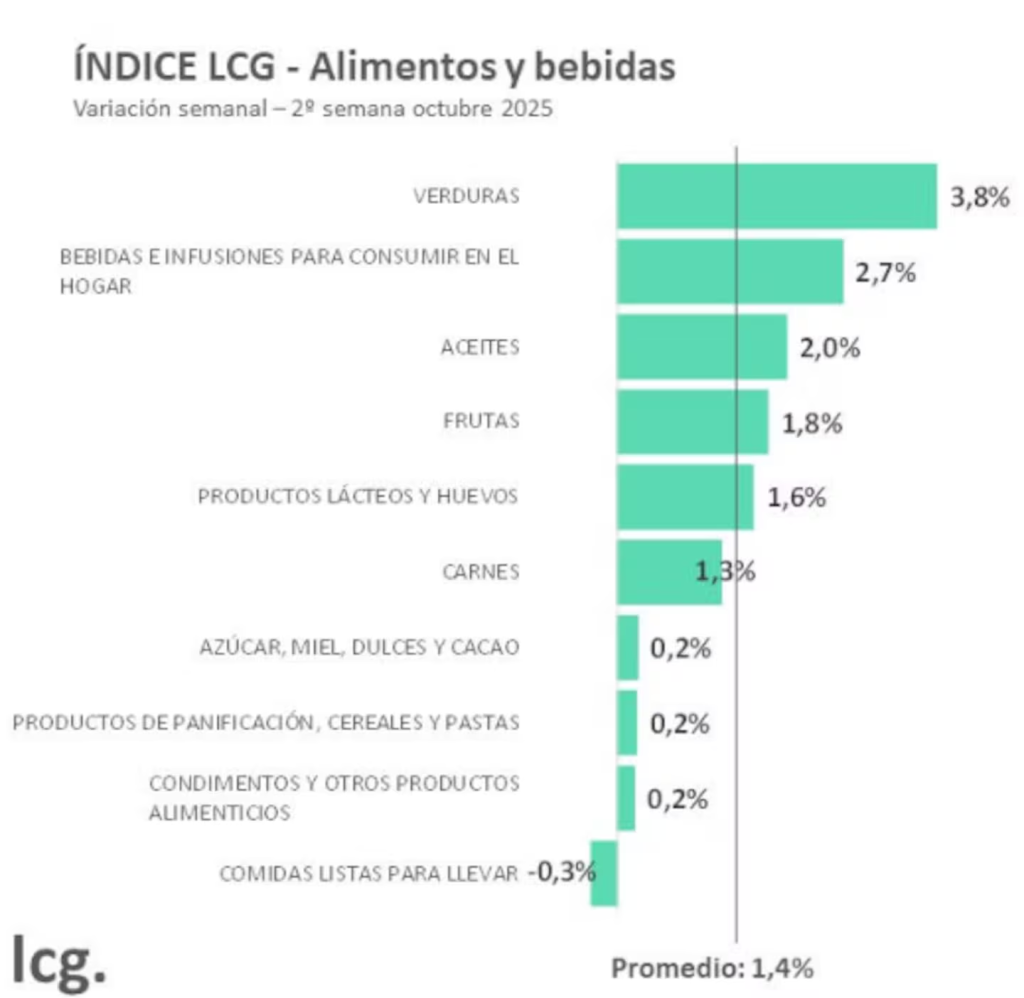 Octubre inició con una contracción de precios en los alimentos de 0,4%, pero durante la segunda semana, el panorama se revirtió y el relevamiento de LCG mostró un alza de 1,4%.
