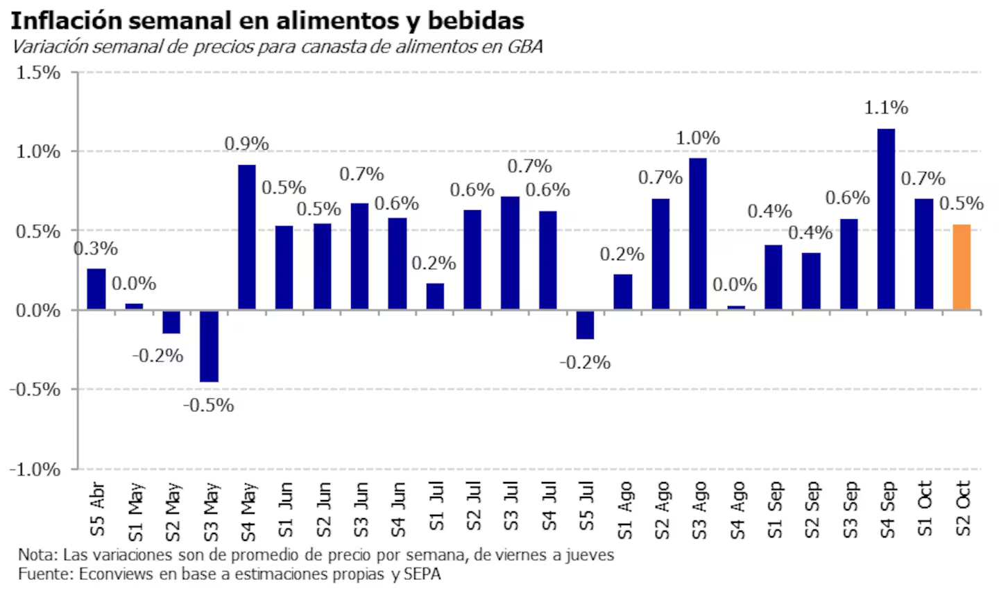 Por su parte, desde Econoviews registraron una variación semanal inferior en los precios de los alimentos. El indicador registró un incremento de 0,5%, impulsados por las carnes (1,5%) y las verduras (0,9%).