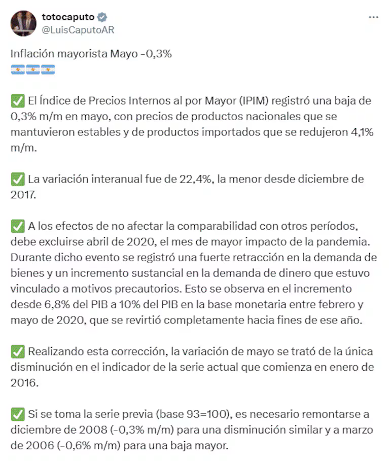 “La variación interanual fue de 22,4%, la menor desde diciembre de 2017. Si se toma la serie previa (base 93=100), es necesario remontarse a diciembre de 2008 (-0,3% m/m) para una disminución similar y a marzo de 2006 (-0,6% m/m) para una baja mayor″, señaló el ministro de Economía, Luis Caputo, en su cuenta de X.