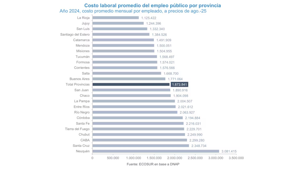 A partir del gasto total en personal y la cantidad de empleados, Ecosur calculó el costo laboral promedio en cada administración provincial. Si bien aclararon que no equivale estrictamente al salario —porque incluye aportes patronales y otros conceptos asociados a diversas modalidades de contratación— constituye una aproximación del ingreso medio en el empleo público provincial y permite comparar entre jurisdicciones.