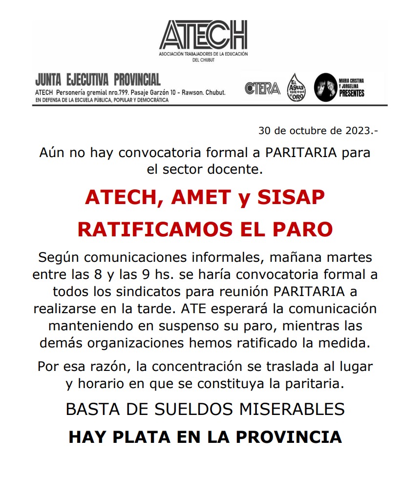 “Mientras tanto el paro de actividades se ha iniciado por 48 horas, ratificado por ATECh, AMET, y SISAP, en tanto ATE se mantiene en suspenso aguardando que se confirme la convocatoria a paritarias que fue comprometida ayer por parte del Poder Ejecutivo”.