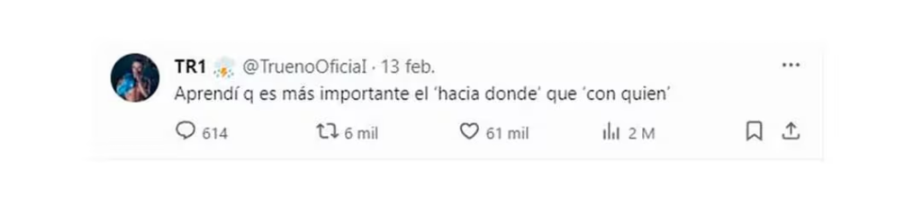 Aunque cabe destacar que Khea no fue el único ex que decidió escribir en esa red social en medio de la separación entre Peso Pluma y Nicki, Trueno, que es su último exnovio antes de que Nicole empezara a salir con el mexicano, también decidió dejar un mensaje en X que llamó la atención de todos los internautas: “Aprendí que es más importante el ‘hacia dónde’ que ‘con quién’”, publicó en juego de palabras similar al que la rosarina sacó en el comunicado anunciando el final de su retacón. ¿Será que sí es un mensaje para la cantante o simplemente fue una frase al pasar que casualmente, la escribió el mismo día del escándalo?