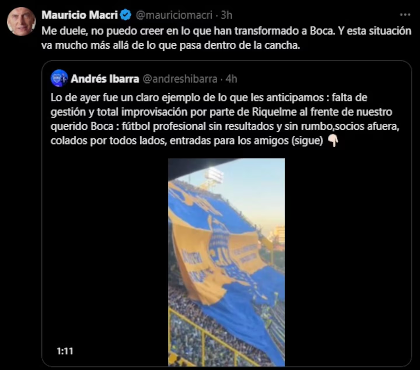 No es la primera vez que Macri habla de Boca o critica a Riquelme. En el último Superclásico que el Xeneize perdió 1-0 ante River en la Bombonera, el exmandatario utilizó su cuenta de X para expresarse. “Me duele, no puedo creer en lo que han transformado a Boca. Y esta situación va mucho más allá de lo que pasa dentro de la cancha”, escribió citando un tuit de Andrés Ibarra, quien encabezó la fórmula opositora en las últimas elecciones.