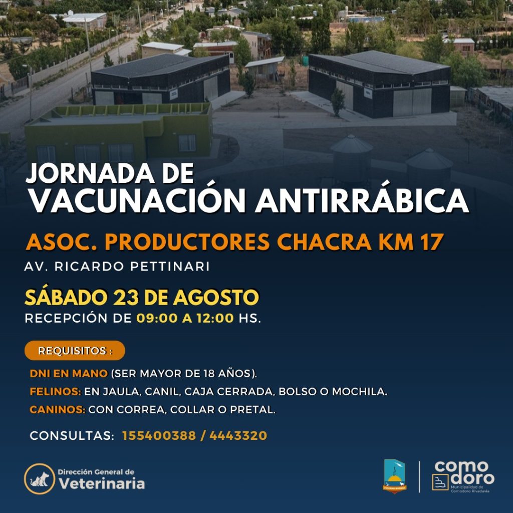 La Municipalidad de Comodoro Rivadavia, a través de la Dirección General de Veterinaria, realizará una jornada de vacunación antirrábica destinada a perros y gatos este sábado 23 de agosto en la Asociación de Productores de Chacra Km 17, ubicada sobre la Av. Ricardo Pettinari.