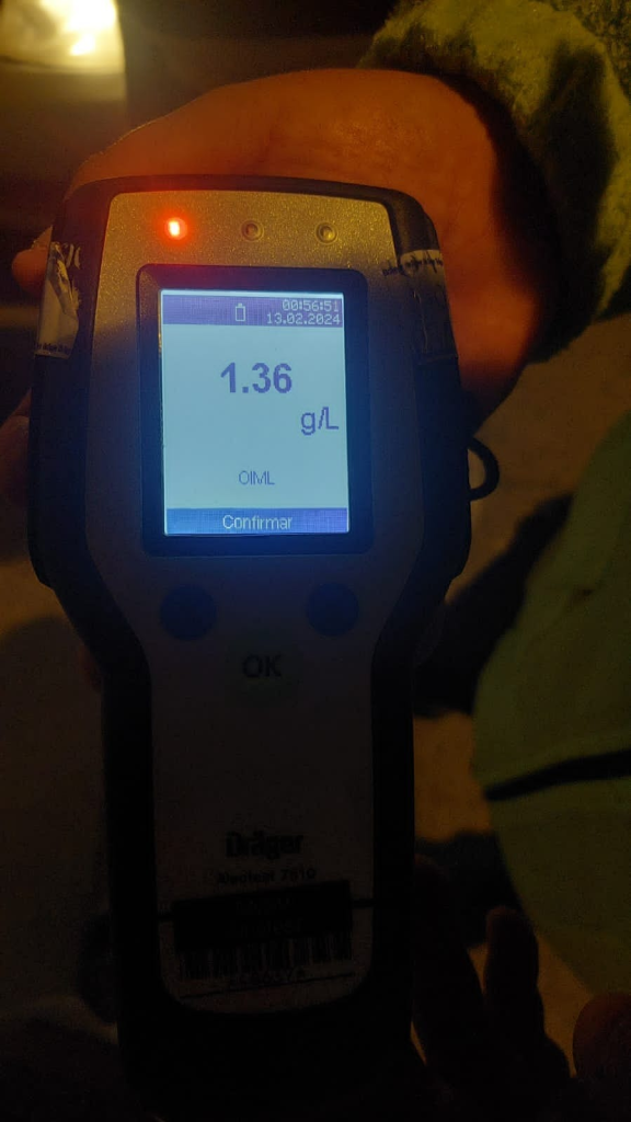 El conductor del Chevrolet Corsa, sometido a un test de alcoholemia, arrojó un resultado positivo de 1,36 g/l de alcohol en sangre, mientras que el conductor del otro vehículo dio negativo en la prueba, registrando 0,00 g/l.