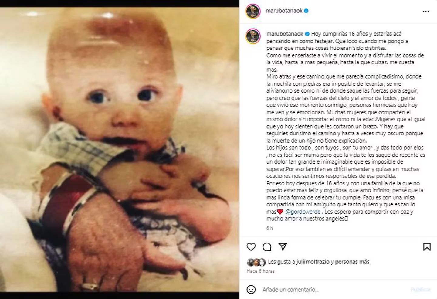 Tras hacer un repaso del arduo camino recorrido, Botana expresó: “Hoy después de 16 años y con una familia de la que no puedo estar más feliz y orgullosa, que amo infinito, pensé que la más linda forma de celebrar tu cumple, Facu, es con una misa compartida”. “Los espero para compartir con paz y mucho amor a nuestros ángeles”, cerró.