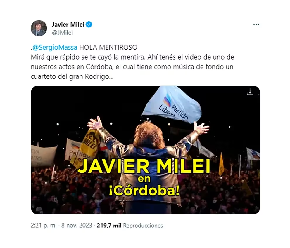 “Hola, mentiroso. Mirá que rápido se te cayó la mentira. Ahí tenés el video de uno de nuestros actos en Córdoba, el cual tiene como música de fondo un cuarteto del gran Rodrigo”, respondió el candidato libertario en su cuenta de Twitter, junto con un material audiovisual que anunciaba su arribo en la campaña que comenzó en febrero del año pasado.