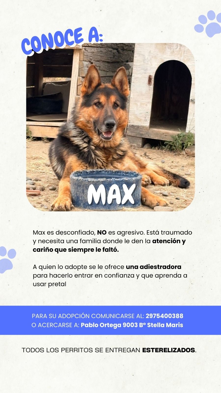Max es un perro adulto que actualmente se encuentra en adopción y necesita una familia dispuesta a brindarle el tiempo, la estabilidad y el amor que no tuvo en su pasado. Según explicaron desde la organización que lo resguarda, es un animal cariñoso y sensible, aunque desconfiado producto de experiencias traumáticas. Aclaran que no es agresivo, pero sí requiere un proceso de adaptación responsable.