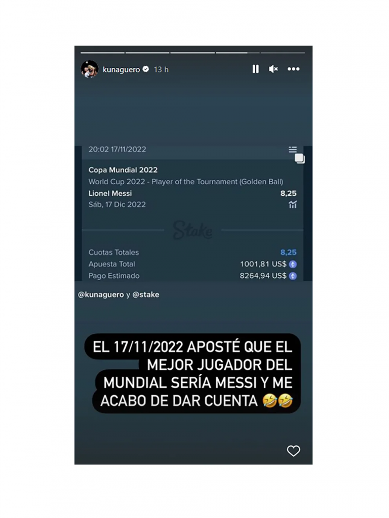 El Kun subió una historia de Instagram en la que develó que el 17 de noviembre del 2020 apostó por la Pulga como ganador al premio “Golden Ball” (mejor jugador del torneo).