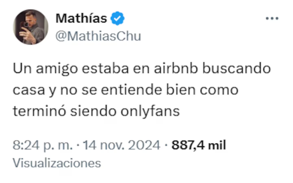 “Un amigo estaba en Airbnb buscando casa y no se entiende bien como terminó siendo OnlyFans”, escribió Mathias en la descripción del tuit que llegó a 887 mil reproducciones y 23 mil “me gusta”.