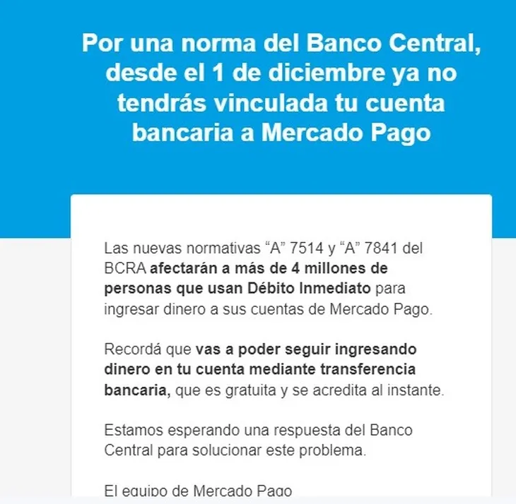Mercado Pago informó este miércoles a todos sus usuarios que desde el primero de diciembre de este año, por una norma del Banco Central (BCRA), ya no tendrán vinculada su cuenta bancaria a la billetera virtual.