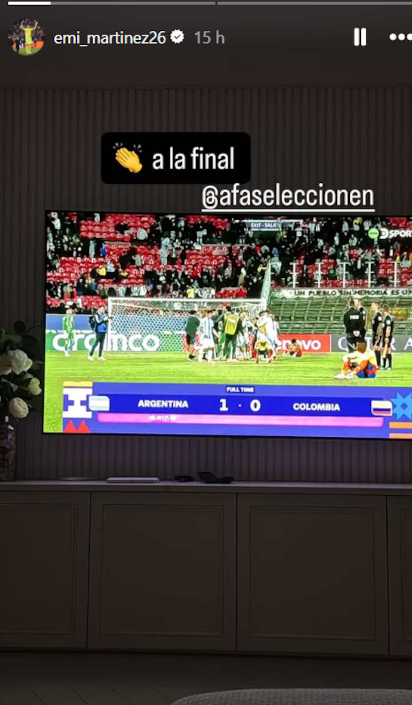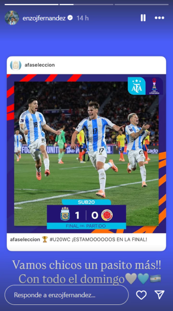 Luego, el Dibu Martínez, Enzo Fernández y Leandro Paredes felicitaron a la Selección Sub 20 por la clasificación a la final. “A la final”, destacó el arquero en sus redes sociales y sumó un emoji de aplausos.