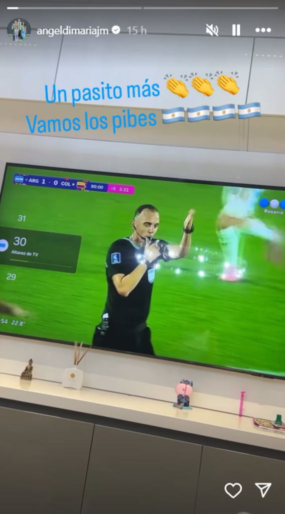 Aunque ya no forma parte de la Selección argentina, Ángel Di María sigue muy vinculado a la Albiceleste y también utilizó sus redes sociales para festejar la hazaña conseguida por los juveniles. El actual futbolista de Rosario Central filmó el final del partido y dijo: “Un pasito más. Vamos los pibes”.