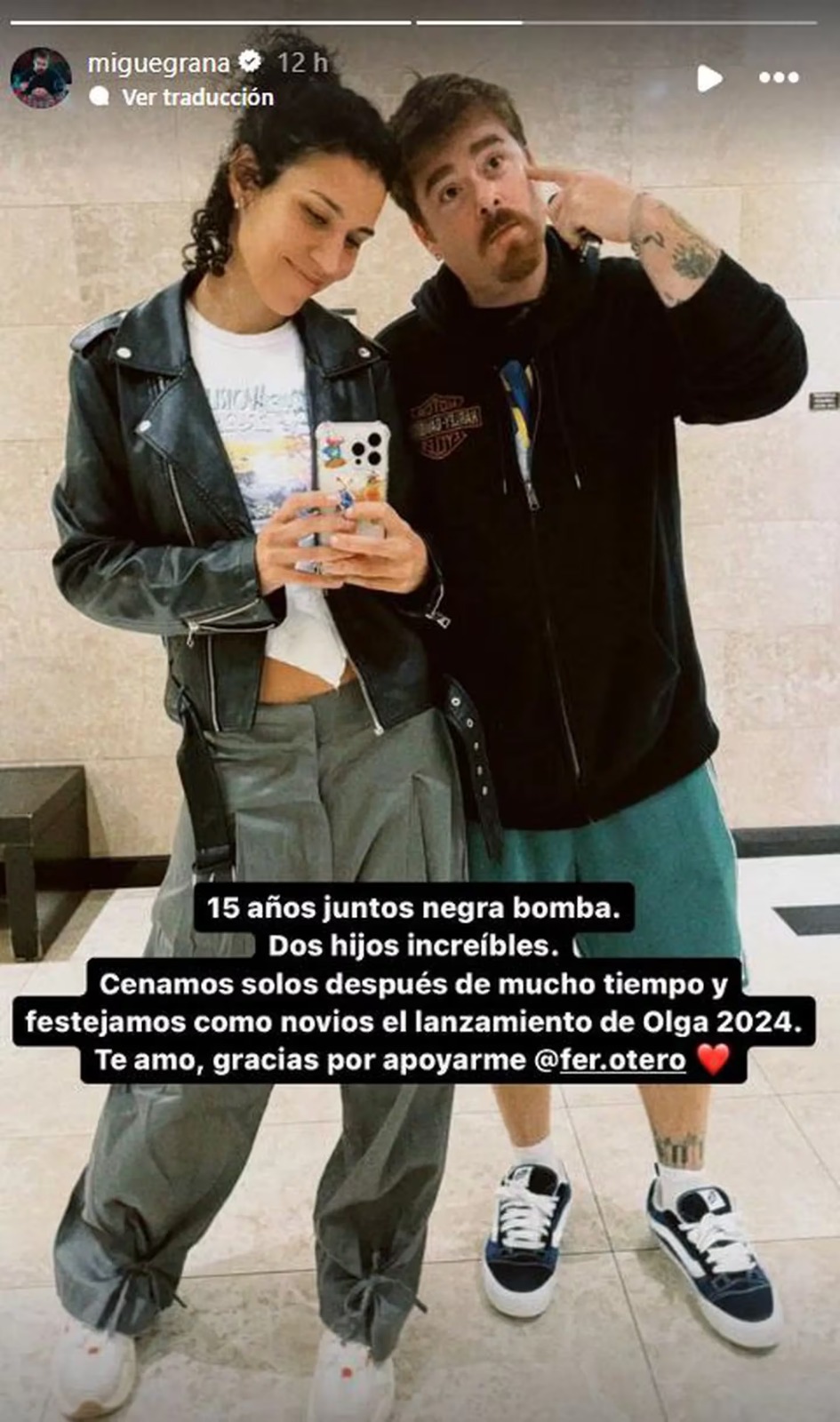 Migue Granados quiso celebrar sus 15 años de amor junto a Fernanda Otero y usó sus redes sociales para dedicarle un tierno posteo. “15 años juntos, negra bomba. Dos hijos increíbles. Cenamos solos después de mucho tiempo y festejamos como novios el lanzamiento de Olga 2024″, escribió el humorista acompañando una foto con su novia.