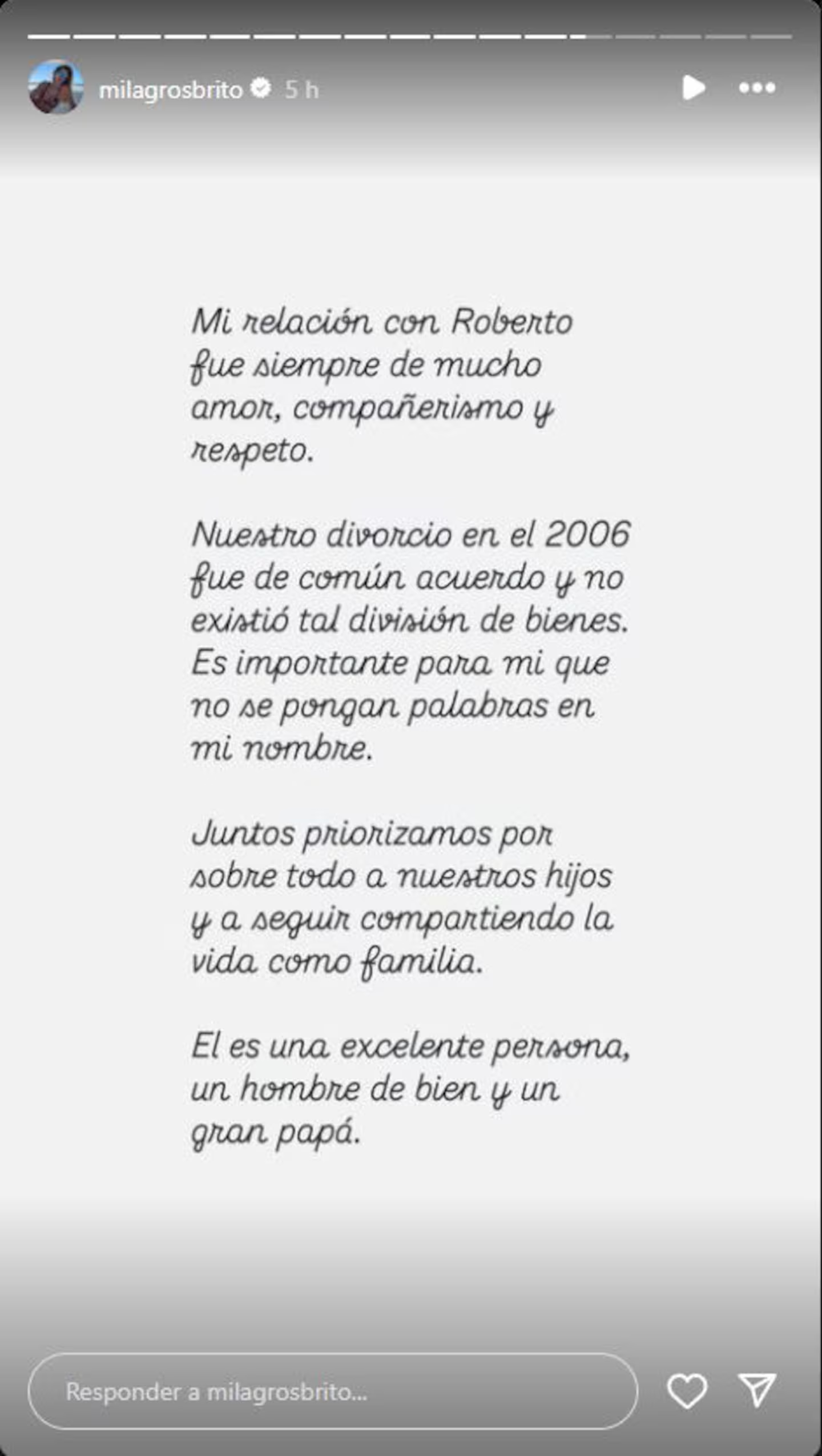 “Mi relación con Roberto fue siempre de mucho amor, compañerismo y respeto”, comenzó escribiendo en una historia de Instagram.