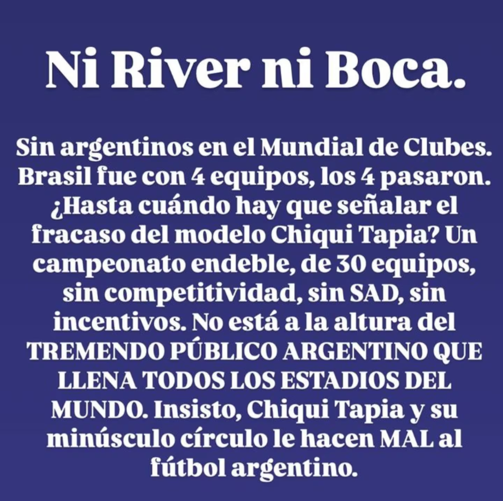 “Ni Boca ni River: sin agentinos en el Mundial de Clubes. Brasil fue con 4 equipos, los 4 pasaron. ¿Hasta cuándo hay que señalar el fracaso del modelo de Chiqui Tapia? Un campeonato endeble, de 30 equipos, sin competitividad, sin SAD, sin incentivos. No está a la altura del tremendo público argentino que llena todos los estadios del mundo. Insisto, Chiqui Tapia y su minúsculo círculo le hacen mal al fútbol argentino“, publicó el presidente.