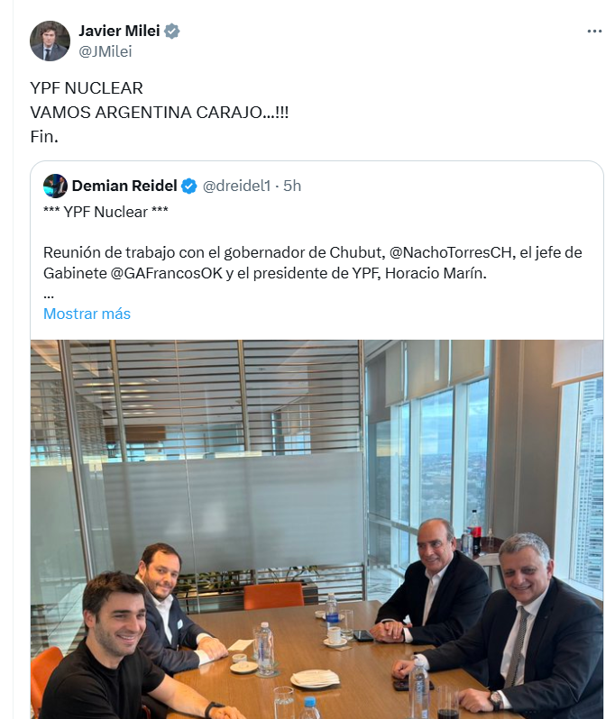 Reidel había publicado el miércoles un posteo en el que daba detalles de una “reunión de trabajo con el gobernador de Chubut, Nacho Torres, el jefe de Gabinete, Guillermo Francos, y el presidente de YPF, Horacio Marín. YPF avanza en el diseño institucional de YPF Nuclear, su nueva subsidiaria que liderará la minería de uranio en Argentina, comenzando en Chubut”, señaló Reidel.
