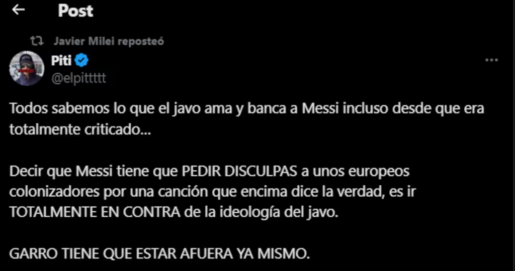 En medio de la controversia que se generó por los cantos de la Selección argentina tras haberse consagrado en la Copa América, el presidente Javier Milei compartió una publicación que pedía que echara al subsecretario de Deportes, Julio Garro.