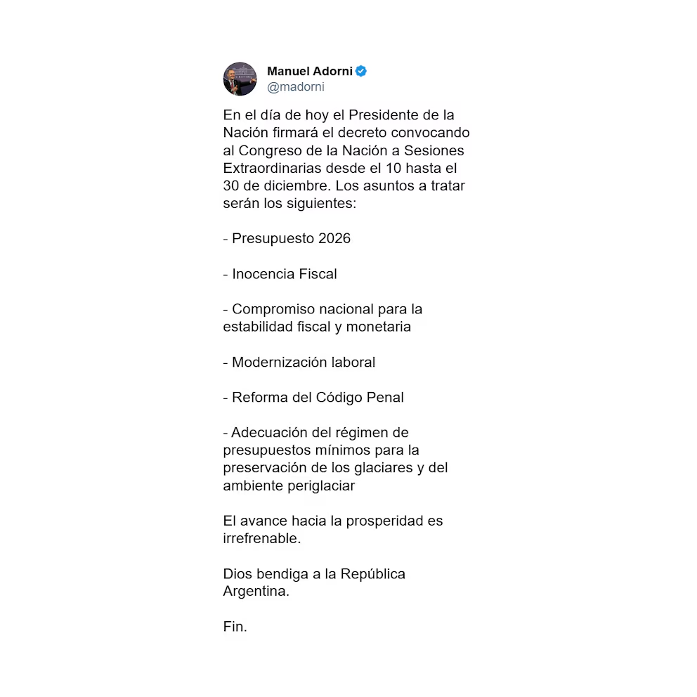El anuncio fue hecho esta tarde por el jefe de Gabinete, Manuel Adorni, que comunicó que el Presidente se aprestaba a firmar el decreto de la convocatoria, el cual incluirá el Presupuesto 2026, la Ley de Inocencia Fiscal, la reforma laboral (o Ley de Modernización Laboral), la reforma tributaria, la modificación de la Ley de Glaciares (que incluye cambios en otras normativas) y la reforma del Código Penal.