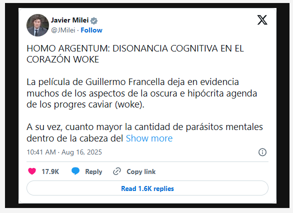 El Presidente también resaltó que la película tuvo éxito sin financiamiento estatal, y sostuvo que eso evidencia el fracaso de muchos en el rubro audiovisual. Cerró su publicación con el consabido “VLLC!” y una postdata directa: “No se enojen con la realidad y los datos, traten de salir de la miserable vida que viven con altura…”.