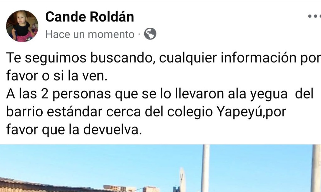 Según contó, «las 2 personas que se lo llevaron a la yegua del barrio Standard, cerca del colegio Yapeyú, por favor que la devuelvan».