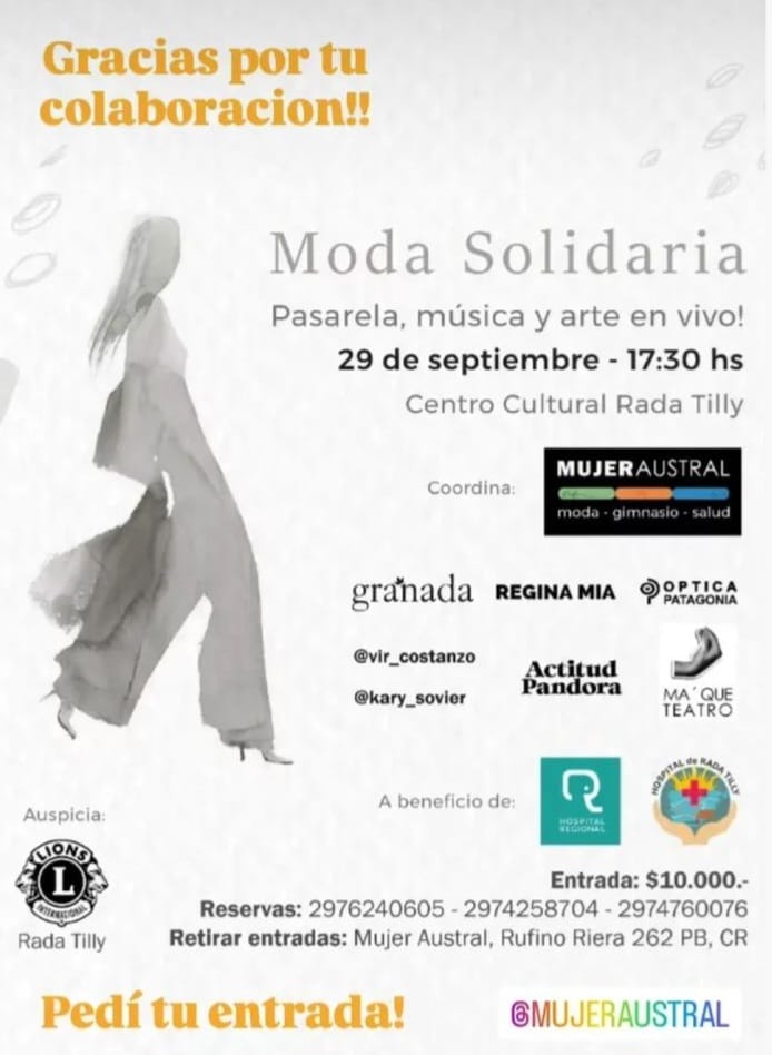 Y comentó: «Vamos a lucir ropa de Regia Mía, de Km3 que siempre Marina trabaja conmigo y tiene una colección de adolescentes super linda. Después Granada de Rada Tilly y Óptica Patagónica, vamos a usar todos los lentes, no solamente de sol sino también recetados para que se usen esta temporada. Después, van a participar Virginia Constanzo, que va a hacer una pintura en vivo y que se va a subastar, dinero que también se va a juntar para el Hospital y van a estar los chicos de Ma’ Que Teatro, va a cantar Cari Sobier, el lugar y la conducción es cedido por la Municipalidad de Rada Tilly. También nos va a ayudar, y es todo solidario, la parte de fotografía y coordinación de parte de Mujer Austral».