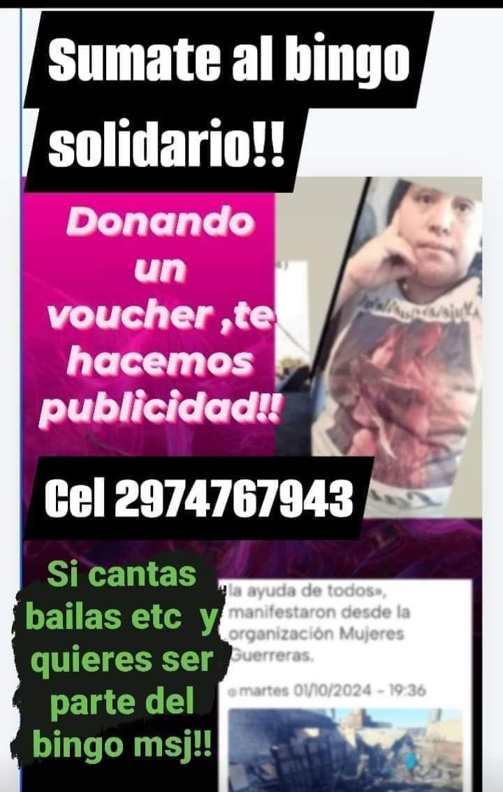 En diálogo con FM La Petrolera 89.3 MHz, explicó: «El día 17 de noviembre vamos a realizar un bingo a beneficio de Laura. Ella perdió todo en el incendio en el mes de abril, así que bueno, necesita comprar materiales»