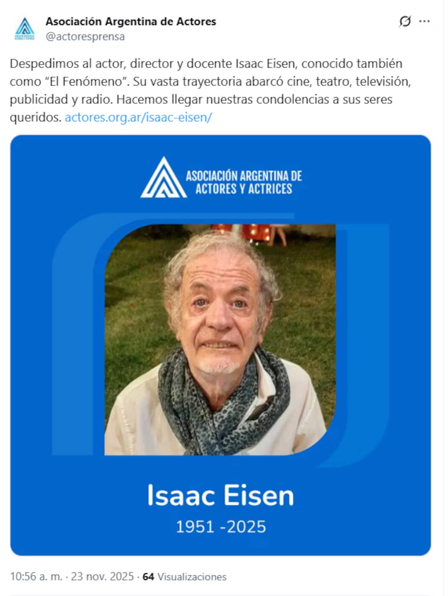 “Despedimos al actor, director y docente Isaac Eisen, conocido también como ‘El fenómeno’. Su vasta trayectoria abarcó cine, teatro, televisión, publicidad y radio”, se lee en el comunicado de la Asociación Argentina de Actores.