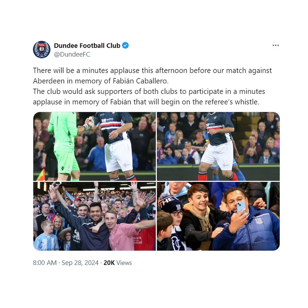 Otro equipo de Europa en el que fue amado Caballero fue el Dundee de la primera división de Escocia. Allí estuvo desde el 2000 hasta el 2005 y se ganó el amor de todos sus hinchas. “Habrá un minuto de aplausos esta tarde antes de nuestro partido contra el Aberdeen en memoria de Fabián Caballero. El club pide a los aficionados de ambos clubes que participen en un minuto de aplausos en memoria de Fabián que comenzará al sonar el pitido arbitral”, fue el sentido mensaje del cuadro escocés y el homenaje que le harán a Tyson.