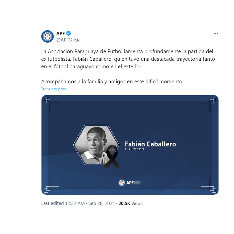 “La Asociación Paraguaya de Fútbol lamenta profundamente la partida del ex futbolista, Fabián Caballero, quien tuvo una destacada trayectoria tanto en el fútbol paraguayo como en el exterior. Acompañamos a la familia y amigos en este difícil momento”, escribió sentidamente la AFP en su redes. Después de una contrastada carrera, en la cual llegó a jugar en Corea del Sur, Chipe, Grecia, Guatemala y Chile, Tyson atravesó los últimos años de su historia en Tacuary, Sportivo Ameliano y Deportivo Recoleta, institución en la que colgó los botines en el año 2014.