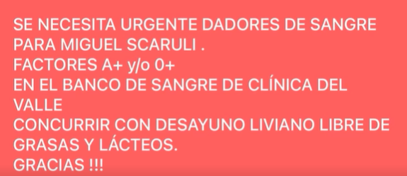 La Clínica del Valle informa a la comunidad que se encuentra en búsqueda urgente de donantes de sangre con factores A+ y/o O+ para Miguel Scarulli, reconocido dirigente histórico del radicalismo y referente del Centro de Jubilados de Km. 3.