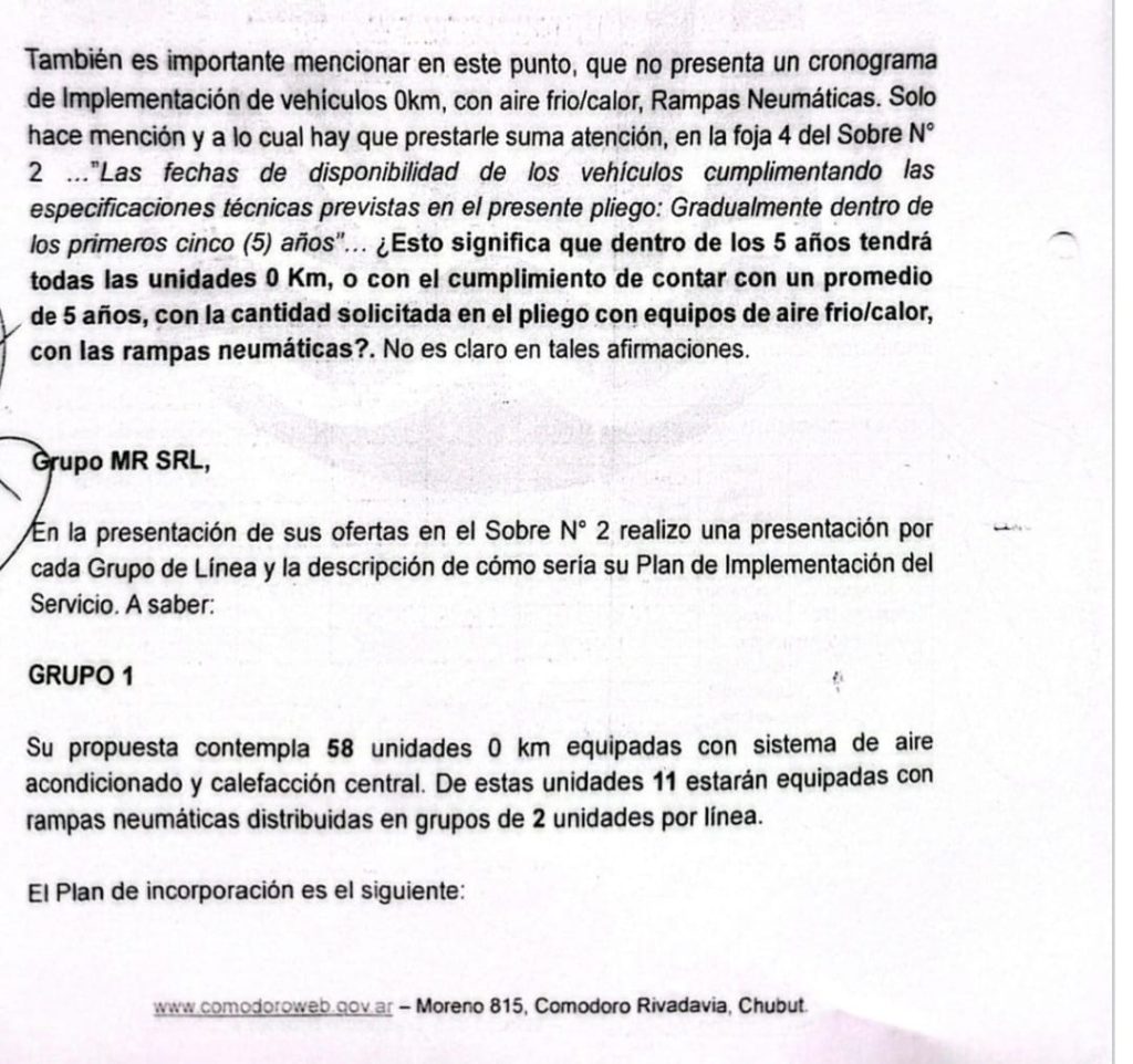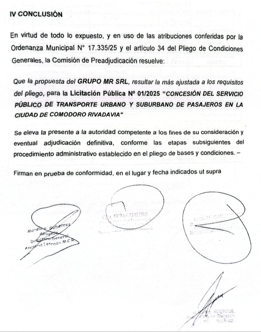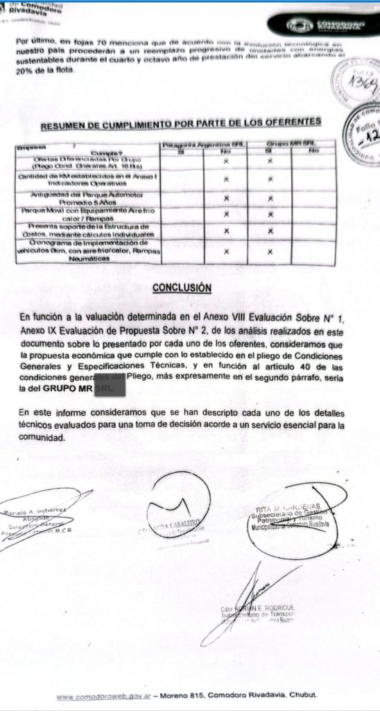 La comisión integrada por Adrián Rodriguez, sub secretario de transporte, Rita Cárdenas, sub secretaria de economía, la histórica contadora Nora Cabaleiro y Marcela Gutierrez, directora general de asesoría letrada concluyeron que «la mejor propuesta es la del grupo MR SRL ya que resulta la más ajustada a los requisitos del pliego para la licitación pública N° 01/2025 Concesión del servicio público de transporte urbano y suburbano de pasajeros en la ciudad de Comodoro Rivadavia».