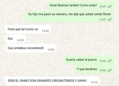 En el chat, la joven preguntó por el precio y qué tenía, a lo que la mujer respondió con total naturalidad: “$5000 el ramo, son grandes, crisantemos y sanvi”. La confusión escaló cuando la joven pidió 2 gramos y la florista, sin notar la confusión, continuó explicando cómo podía entregar el ramo, incluso aclarando que su marido estaba “re ocupado”.