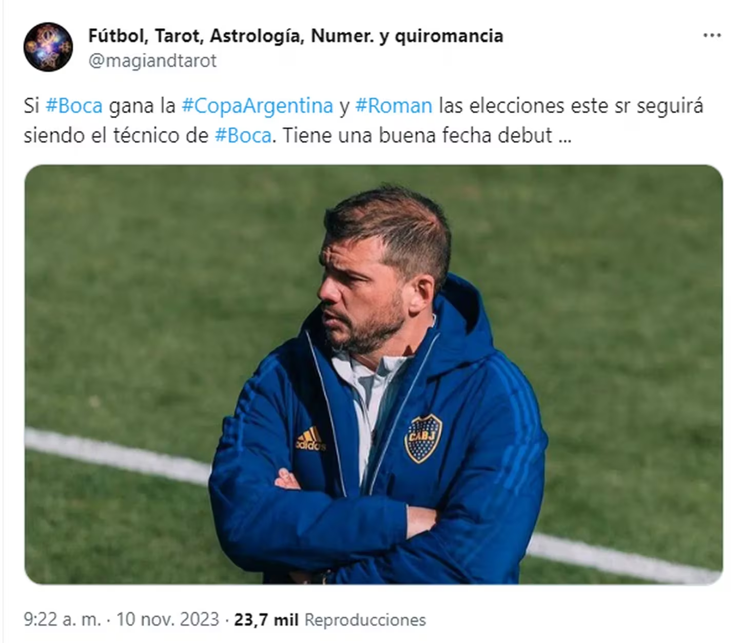 “Si Boca gana la Copa Argentina y Román gana las elecciones, este señor seguirá siendo el técnico de Boca. Tiene una buena fecha de debut”, lanzó la cuenta de X, @magiandtarot, y adjuntó una foto de Herrón.