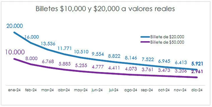 Ante estas cuestiones, y viendo como la inflación antes de estabilizarse aumentará, hay que evaluar el ingreso de los billetes de $10.000 y $20.000. En ese sentido, la consultora aseguró que, si se asume un 2024 con inflación por sobre el 213%, se considera que estas nuevas denominaciones al final del período valdrán aproximadamente $2.961 y $5.979 respectivamente, lo que significa que «la pérdida de poder adquisitivo es inminente en el tiempo», definió.