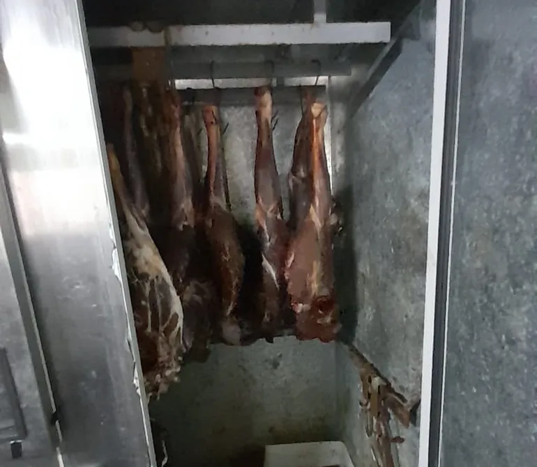 Una vez en el lugar, se procedió a la constatación y secuestro de doce (12) paletas, seis (06) cuartos, un (01) lomo y dos tubos de carne picada de la especie Lama Guanicoe Guanaco. Previo a la toma fotográfica, se procedió al secuestro de dichos elementos, los cuales fueron cargados en el móvil RI 1171 para su posterior incineración en la Comisaría de Camarones.