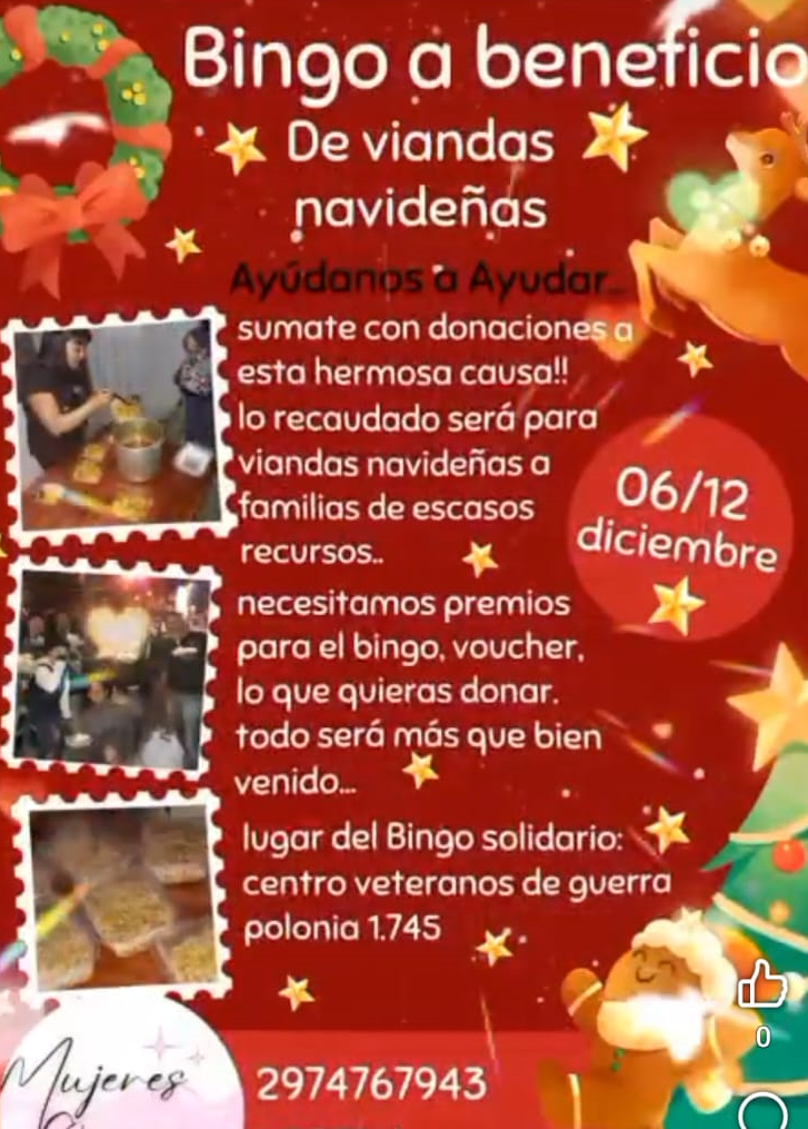 Se realizará un bingo solidario navideño el próximo sábado 6 de diciembre a las 15 horas en el Centro de Veteranos de Guerra, ubicado en la avenida Polonia 1685, con la finalidad de recaudar fondos para la elaboración de viandas navideñas destinadas a familias de escasos recursos en la ciudad.
