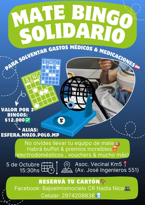El mate bingo contará con increíbles premios, buffet, shows en vivo y cuerpos de baile, además de un clima solidario que busca reunir a toda la comunidad. El valor de los cartones es de $12.000 por tres bingos.