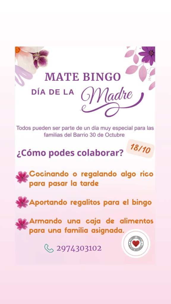 “En esta ocasión estoy organizando un mate bingo para el Día de la Madre. La idea es que las mamás disfruten de una tarde con juegos, regalos y sorpresas, mientras que, en paralelo, podamos entregar una caja de alimentos a cada familia de un listado que nos pasó Cáritas junto al grupo Proyectando Futuro”, explicó Carrasco.