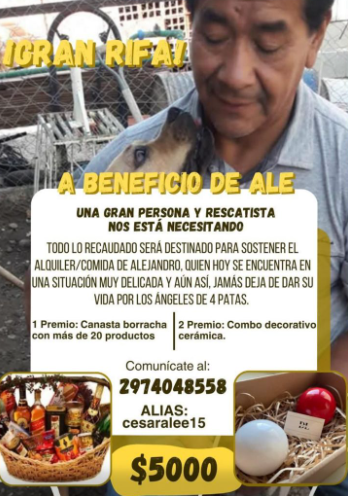 Familiares, amigos y voluntarios lanzaron una rifa solidaria para ayudar a Alejandro, un reconocido rescatista de animales de la ciudad, quien actualmente se encuentra atravesando un difícil momento económico y de salud. El objetivo de la campaña es juntar fondos para colaborar con los gastos de alquiler y alimentación.