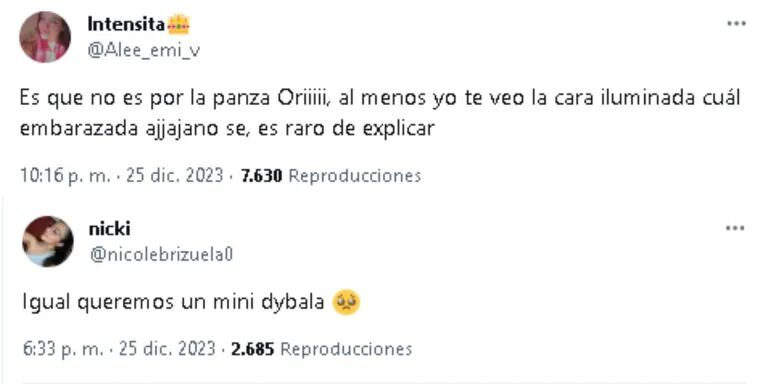 Aunque los seguidores todavía manifestaron su deseo sobre la pareja acerca de un posible embarazo y una joven señaló: “Igual queremos un mini Dybala”. Mientras que otros comentaron: “Para mí lo dicen por la cara”; “La cara iluminada” y “Tenés que admitirlo”, a la vez que muchos la defendieron.