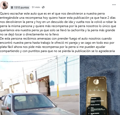 “Cuando encontró nuestra perra hasta trabajo le ofreció mi pareja y se cagó en todo eso por plata fácil. Ahora nos pide más recompensa por la perra”, lamentó la denunciante. La familia pidió colaboración a la comunidad para difundir el caso.
