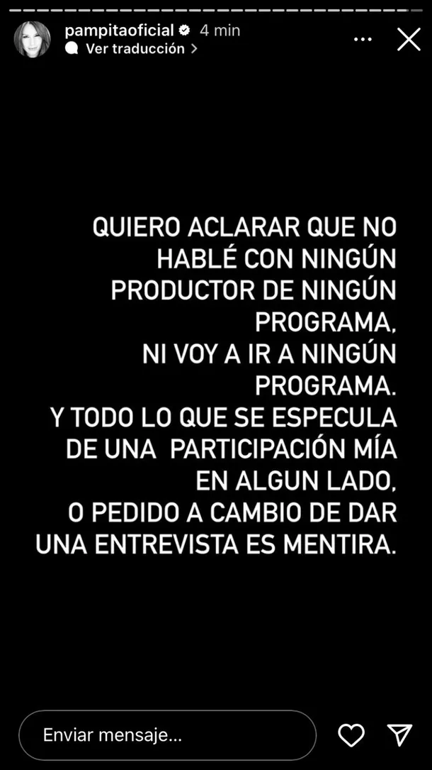 En medio del escándalo por su separación definitiva de Roberto García Moritán, Pampita Ardohain usó su cuenta de Instagram para desmentir las versiones que indicaban que haría una entrevista exclusiva con Susana Giménez para hablar del tema.