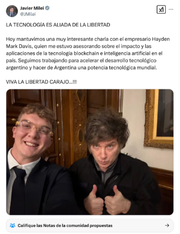El 14 de febrero de 2025, el presidente Javier Milei publicó en su cuenta personal de X un mensaje celebrando el lanzamiento de un proyecto privado que, según el posteo, buscaba “fondear pequeñas empresas y emprendimientos argentinos” mediante el uso de la criptomoneda $LIBRA. El mensaje incluía enlaces al sitio web del proyecto y a la dirección del token en la plataforma Solana. Tras la publicación, la cotización del criptoactivo experimentó una suba abrupta y posterior caída, lo que generó sospechas de maniobras especulativas y motivó denuncias de presunta estafa.